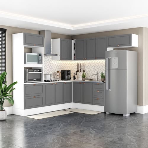 A Cozinha Pérola Completa é a união perfeita entre elegância e funcionalidade, composta por 8 módulos com design americano contemporâneo que transformam qualquer ambiente. Com 219,4 cm de altura, largura total de 492 cm (252 240 cm) e balcões com 52 cm de profundidade, ela oferece amplo espaço e organização. As portas e gavetas em MDF usinado em baixo relevo trazem sofisticação, enquanto os puxadores em cobre — modelo concha nos módulos inferiores e pontual nos aéreos — adicionam um toque de charme. Equipada com dobradiças Slide On com sistema de amortecimento (anti-impacto) e pistão na porta basculante para abertura suave, essa cozinha alia beleza e conforto no uso diário. Acabamento da Prateleira: Pintura Escala de Brilho da Prateleira: Semi-Brilho Acabamento da Gaveta: Pintura Escala de Brilho da Gaveta: Semi-Brilho Material do Puxador da Gaveta: Plástico Acabamento da Porta: Pintura Texturizada UV Escala de Brilho da Porta: Semi-Brilho Material do Puxador da Porta: Plástico Acompanha Rodapé Decorativo: Sim Acompanha Tampo: Não Ambiente Principal: Cozinha Balcão Suporta Pia: Sim codigo_ean: 7900288193865 Complexidade da Montagem: Alta: deve ser montado por um montador especializado Cor: Cinza/Branco Cor do Produto: Cinza/Branco Cor Interna: Branco Escala de Brilho: Semi-Brilho Gaveta com Chave: Não Itens Inclusos: 1 Cozinha Completa, Kit de Ferragens, Manual de Montagem e Termo de Garantia Linha ou Coleção: Pérola Manual de Montagem e Instalação: https://product-hub-prd.madeiramadeira.com.br/559696978/documents/9936a45a-134f-4d5c-ae29-5fc28f976b723069850622417525226625022.pdf Marca: Yescasa Material da Corrediça: Metálica Material da Dobradiça/Corrediça da Porta: Metálica Material da Gaveta: MDF/MDP Material da Porta: MDF/MDP Material da Prateleira: MDF/MDP Medida de cada item (A x L x P): Balcão (84cm x 120cm x 50,5cm); Aéreo 3 Portas (67cm x 120cm x 36,5 cm); Basculante ( 33,5cm x 80cm x 36,5cm); Aéreo Canto (67cm x 90+52cm x 35cm); Balcão Canto ( 94cm x 90+52cm x 52cm) ; Balcão 2 Portas (93,7cm x 80cm x 52 cm) ; Torre quente (219,4 cm x 70,2cm x 52cm) modular: Sim Necessita Montagem: Sim O Balcão Acompanha Pia: Não Origem do Produto: Nacional Peso: 227 kg Peso Máximo por Gaveta: 5 kg Peso Máximo por Prateleira: 3 kg Possui Pés: Não Possui Portas: Sim Possui Prateleiras: Sim Possui recorte para Cooktop: Não Produto Montado: Sim Recomendações de Uso, Manutenção e Limpeza: Utilize um pano macio umedecido com água e sabão neutro, seguido de pano seco. Não utilize produtos químicos ou abrasivos para limpeza, pois estes danificam o revestimento do móvel. Sistema de Montagem: Cavilha, Parafuso, Minifix e prego. Acompanha bucha e parafuso para fixação na parede Tamanho Indicado do Tampo: 120x52 Tipo de Corrediça da Gaveta: Simples Tipo de Dobradiça da Porta: Soft close Tipo de Dobradiça/Corrediça da Porta: Soft Close Tipo de Puxador da Gaveta: Externo Tipo de Puxador da Porta: Externo