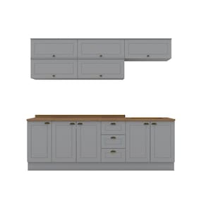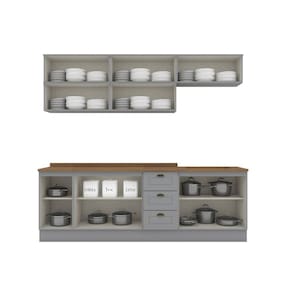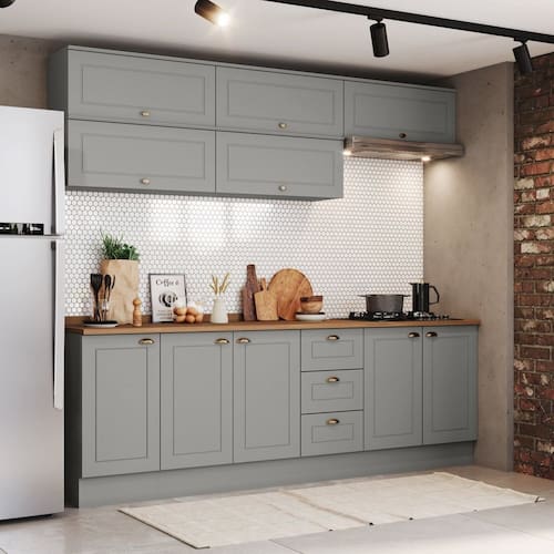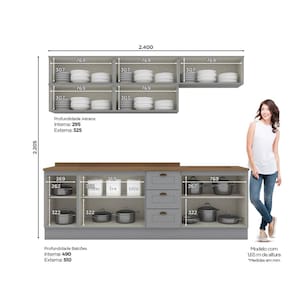 Cozinha Completa Internacional 8 Peças, possui 2.205mm de Altura, 2.715mm de Largura e 510mm de Profundidade. Um novo conceito inspirado nas clássicas cozinhas estilo americano, seu design contemporâneo embeleza qualquer ambiente. Projetado para proporcionar praticidade e funcionalidade ao uso. Produto 100% MDF, disponibiliza de várias opções de módulos que possibilitam diversas composições lineares, possui detalhes usinados em baixo relevo nas portas e gavetas, puxadores nos balcões em formato de concha e nos aéreos são pontuais, ambos na cor ouro velho, possui dobradiças de 35mm com amortecimento, aéreos com 830mm de alturas, gavetas com corrediças telescópicas proporcionando maior abertura. A sua instalação pode ser feita tanto com o uso dos rodapés ou suspensa. Acabamento da Prateleira: Pintura Texturizada UV Escala de Brilho da Prateleira: Fosco Acabamento da Gaveta: Pintura Texturizada UV Escala de Brilho da Gaveta: Fosco Material do Puxador da Gaveta: Metal Acabamento da Porta: Pintura Texturizada UV Escala de Brilho da Porta: Fosco Material do Puxador da Porta: Metal Acabamento dos Pés: Pintura Acompanha Tampo: Sim Ambiente Principal: Cozinha Complexidade da Montagem: Alta: deve ser montado por um montador especializado Cor: Cinza/Marrom Cor do Produto: Cinza/Marrom Cor Interna: Trama Escala de Brilho: Fosco Espessura do Material da Estrutura: 15 mm Espessura do Tampo: 25 mm Gaveta com Chave: Não Informações Complementares: Vem com todos os tampos, mas o central pode ser substituído por um tampo/pia de inox Itens Inclusos: 3 Balcões, 3 Tampos, 5 Aéreos, Kit Ferragens e Manual de Montagem Linha ou Coleção: Internacional - Henn Manual de Montagem e Instalação: https://product-hub-prd.madeiramadeira.com.br/924733/documents/f3570fea-baf9-476b-927c-c1eb6ea26b98215675743251721414183945.pdf Material da Dobradiça/Corrediça da Porta: Metálica Material da Gaveta: MDF Material da Porta: MDF Material da Prateleira: MDF Material do Fundo: MDF Material do Tampo: MDF Material dos Pés: MDF Medida de cada item (A x L x P): (A x L x P) Balcão Pia: 82 x 120 x 51 Cm; Aéreo Basculante: 34 x 80 x 32,5 Cm; Balcão 2 Portas: 82 x 80 x 51 Cm; Balcão 1 Porta: 82 x 40 x 51 Cm Medida do Recorte para Cooktop: 51,5cm x 36cm modular: Sim Necessita Montagem: Sim O Balcão Acompanha Pia: Não Origem do Produto: Nacional Pés Reguláveis: Sim Peso: 151 kg Peso Máximo por Gaveta: 3 kg Peso Máximo por Prateleira: 8 kg Possui Pés: Rodapé Possui Portas: Sim Possui Prateleiras: Sim Possui recorte para Cooktop: Sim Possui Rodízio: Não Possui Vidro: Não Recomendações de Uso, Manutenção e Limpeza: Para limpeza de seu móvel, use uma flanela seca ou umedecida. Não utilize produtos químicos que possam danificar o produto. Sapatas Niveladoras: Não Sistema de Montagem: Parafusos e Cavilhas Suporta Até (kg): 121 kg Tamanho Indicado da Pia: 120 x 51 Cm Tipo de Corrediça da Gaveta: Metálica Telescópica Tipo de Dobradiça da Porta: 35 mm Tipo de Puxador da Gaveta: Externo Tipo de Puxador da Porta: Externo