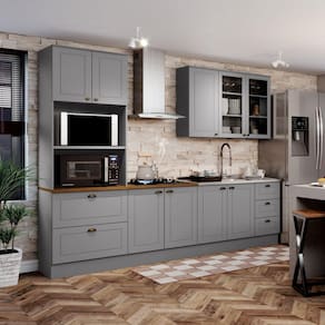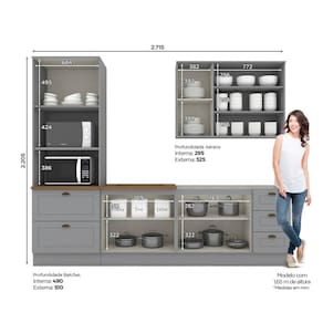 Cozinha Completa Emily 4 Peças, possui 220,5 cm de Altura, 271,5 cm de Largura e 53,5 cm de Profundidade. Um novo conceito inspirado nas clássicas cozinhas estilo americano, seu design contemporâneo embeleza qualquer ambiente. Projetado para proporcionar praticidade e funcionalidade ao uso. Produto 100% MDF, disponibiliza de várias opções de módulos que possibilitam diversas composições lineares, possui detalhes usinados em baixo relevo nas portas e gavetas, puxadores nos balcões em formato de concha e nos aéreos são pontuais, ambos na cor ouro velho, possui dobradiças de 35mm com amortecimento, gavetas com corrediças telescópicas proporcionando maior abertura. A sua instalação pode ser feita tanto com o uso dos rodapés ou suspensa.