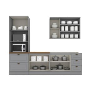 Itens Inclusos: 1 Torre Quente com espaço para dois eletros, 1 Balcão com Tampo para Cooktop, 1 Balcão para Pia, 1 Aéreo 3 Portas, Kit Ferragens e Manual de Montagem