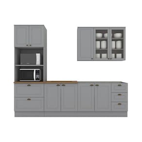 Medida de cada item (A x L x P): 1 Torre Quente 220,5x71,5x51 cm, 1 Balcão com Tampo para Cooktop 82x80x51 cm, 1 Balcão para Pia 82x120x51 cm, 1 Aéreo 83x120x32,5 cm.