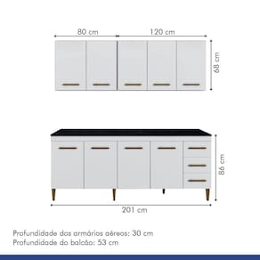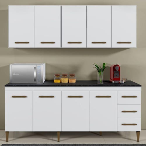 Na hora de mobiliar o seu cômodo de chef você não precisa comprometer a decoração para ter um móvel funcional e que acomode todos aqueles itens essenciais. A Cozinha Atenas não só está preparada para deixar o cômodo com um visual incrível, mas também vai ser a aliada perfeita para armazenar louças, utensílios, alimentos e eletrodomésticos de forma funcional. Já por fora, a peça tem acabamento charmoso com puxadores discretos que ajuda a trazer um toque especial ao ambiente, enquanto as cores versáteis agregam muito à estética dessa peça primorosa. Muito bom gosto para o seu lar-style! Acabamento da Prateleira: Pintura Texturizada UV Escala de Brilho da Prateleira: Semi-Brilho Acabamento da Gaveta: Verniz Escala de Brilho da Gaveta: Semi-Brilho Material do Puxador da Gaveta: MDF Acabamento da Porta: Pintura Escala de Brilho da Porta: Semi-Brilho Material do Puxador da Porta: MDF Acabamento dos Pés: Pintura Acompanha Tampo: Sim Altura dos Pés: 17 cm Altura Máxima dos Pés: 17.0000 Ambiente Principal: Cozinha codigo_ean: 7909903143209 Complexidade da Montagem: Baixa: pode ser montado por uma pessoa sozinha Cor: Branco Cor do Produto: Branco Cor Interna: Branco Escala de Brilho: Semi-Brilho Gaveta com Chave: Não Itens Inclusos: 1 Cozinha, Kit Ferragens e Manual de Montagem. Manual de Montagem e Instalação: https://product-hub-prd.madeiramadeira.com.br/798585/documents/b0d3b953-6f09-4210-8ba2-d947ff498ea98491026222cozinha3pcas1926.pdf Material da Dobradiça/Corrediça da Porta: Metálica Material da Gaveta: MDP Material da Porta: MDP Material da Prateleira: MDP Material do Tampo: MDP Material dos Pés: Plástico Medida de cada item (A x L x P): Balcão - 86cm x 201cm x 53cm, Aereo 2 Portas - 68cm x 80cm x 30cm, Aereo 3 Portas - 68cm x 120cm x 30cm modular: Sim Necessita Montagem: Sim O Balcão Acompanha Pia: Não Origem do Produto: Nacional Pés Reguláveis: Sim Peso: 105,9 kg Peso Máximo por Gaveta: 10 kg Peso Máximo por Prateleira: 10 kg Possui Pés: 08 Possui Portas: Sim Possui Prateleiras: Sim Possui recorte para Cooktop: Não Possui Rodízio: Não Produto Montado: Sim Recomendações de Uso, Manutenção e Limpeza: Recomendamos que a limpeza seja feita apenas com pano umedecido. Rodízio com Trava: Não Sapatas Niveladoras: Não Sistema de Montagem: Parafusos. Tipo de Corrediça da Gaveta: Metálica Telescópica Tipo de Dobradiça da Porta: Simples Tipo de Puxador da Gaveta: Externo Tipo de Puxador da Porta: Externo
