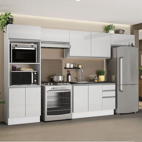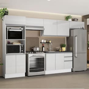- Possui ferragens de qualidade, como puxadores em alumínio e dobradiças e corrediças metálicas.
