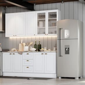 Cozinha Completa Americana 4 Peças com Tampo - Móveis Henn Com design contemporâneo, a Cozinha Americana embeleza qualquer ambiente. Seu conceito é inspirado nas clássicas cozinhas estilo americano, oferecendo uma decoração moderna e minimalista. Ela conta com puxadores em metal zamac, dobradiças 35mm com amortecimento e espaçosos aéreos com 83cm de altura, proporcionando praticidade e funcionalidade. É um armário de cozinha 100% MDF com mais de 15 módulos, que possibilitam criar o projeto de cozinha dos seus sonhos.