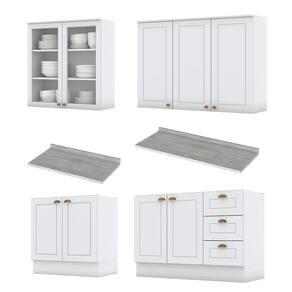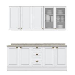ESPECIFICAÇÕES: Estrutura 100% MDF Pintura UV 9 Portas sendo 2 de vidro 3 Gavetas Dobradiças de 35mm com amortecimento Corrediças telescópicas Puxadores em zamac ouro velho Tampos em MDP/BP Opção de instalação sem rodapés, suspensa Balcão Pia não acompanha cuba