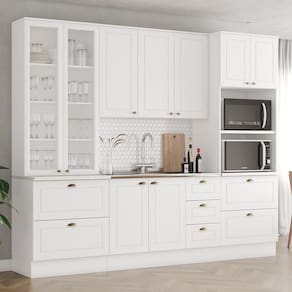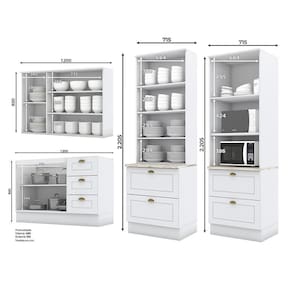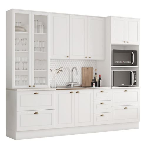 Com design contemporâneo, a Cozinha Americana embeleza qualquer ambiente. Seu conceito é inspirado nas clássicas cozinhas estilo americano, oferecendo uma decoração moderna e minimalista. Ela conta com puxadores em metal zamac, dobradiças 35mm com amortecimento e espaçosos aéreos com 83cm de altura, proporcionando praticidade e funcionalidade. É um armário de cozinha 100% MDF com mais de 15 módulos, que possibilitam criar o projeto de cozinha dos seus sonhos.