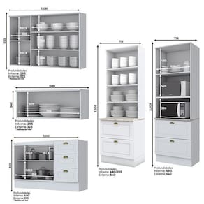 - Espaço para eletrodoméstico: 1- 42,4 x 68,4 x 48,0 cm e 2- 38,6 x 68,4 x 53,3 cm