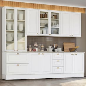 Com design contemporâneo, a Cozinha Americana embeleza qualquer ambiente. Seu conceito é inspirado nas clássicas cozinhas estilo americano, oferecendo uma decoração moderna e minimalista. Ela conta com puxadores em metal zamac, dobradiças 35mm com amortecimento e espaçosos aéreos com 83cm de altura, proporcionando praticidade e funcionalidade. É um armário de cozinha 100% MDF com mais de 15 módulos, que possibilitam criar o projeto de cozinha dos seus sonhos.
