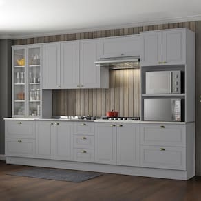 Com design contemporâneo, a Cozinha Americana embeleza qualquer ambiente. Seu conceito é inspirado nas clássicas cozinhas estilo americano, oferecendo uma decoração moderna e minimalista. Ela conta com puxadores em metal zamac, dobradiças 35mm com amortecimento e espaçosos aéreos com 83cm de altura, proporcionando praticidade e funcionalidade. É um armário de cozinha 100% MDF com mais de 15 módulos, que possibilitam criar o projeto de cozinha dos seus sonhos.