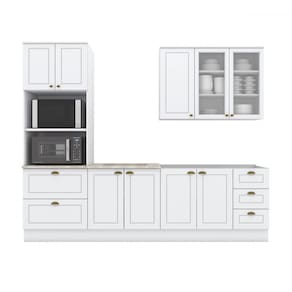 O(a) Cozinha Completa Americana 9 Portas 5 Gavetas com Vidro 100% Mdf Branco - Henn é produzido em 100% MDF na escala de brilho Fosco, e possui um grau de dificuldade de montagem: Médio.