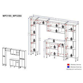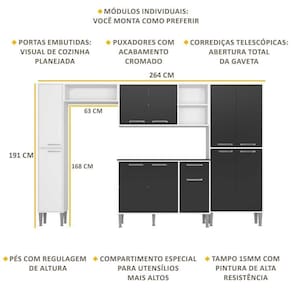 Dimensões do produto montado: Cozinha: Altura: 191 cm - Largura: 334 cm - Profundidade: 27,5 cm (aéreos e paneleiro) - 45 cm (balcão com tampo) Espaço do nicho para fogão/geladeira: Altura: 168 cm - Largura: 63 cm *Você pode consultar as medidas internas na imagem técnica do produto.