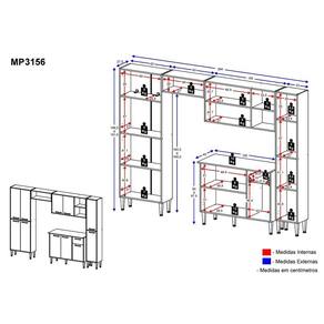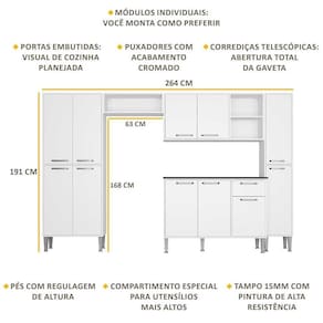 Dimensões do produto montado: Cozinha: Altura: 191 cm - Largura: 334 cm - Profundidade: 27,5 cm (aéreos e paneleiro) - 45 cm (balcão com tampo) Espaço do nicho para fogão/geladeira: Altura: 168 cm - Largura: 63 cm *Você pode consultar as medidas internas na imagem técnica do produto.