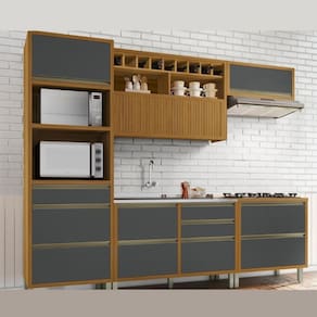 A Cozinha 5 Peças Nesher Baronesa é a solução completa para a sua cozinha dos sonhos. Composta por 2 armários aéreos, 2 balcões e torre quente, todos em 100% MDF com acabamento em Freijó/Grafite, essa cozinha une funcionalidade e elegância em um só lugar. Os armários aéreos proporcionam amplo espaço de armazenamento, enquanto os balcões oferecem uma superfície de trabalho prática e resistente. O torre quente é ideal para organizar seus utensílios e acomodar seu forno e microondas. Transforme sua cozinha em um ambiente sofisticado e funcional com a Cozinha 5 Peças Baronesa.