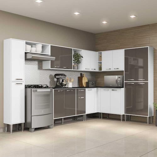 Conteúdo da Embalagem: 1 (um) nicho horizontal 1 (um) armário aéreo de 105 cm 1 (um) paneleiro duplo 1 (um) balcão com tampo de 105 cm 1 (um) balcão com tampo de canto 1 (um) armário aéreo de canto 1 (um) paneleiro simples 1 (um) balcão com tampo de 70 cm 1 (um) armário aéreo de 70 cm