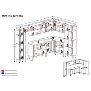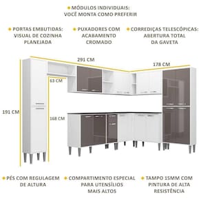 Dimensões do produto montado: Cozinha: Altura: 191 cm - Largura: 291 x 178 cm - Profundidade: 27,5 cm (aéreos e paneleiro) - 45 cm (balcão com tampo) Espaço do nicho para fogão/geladeira: Altura: 168 cm - Largura: 63 cm *Você pode consultar as medidas internas na imagem técnica do produto.