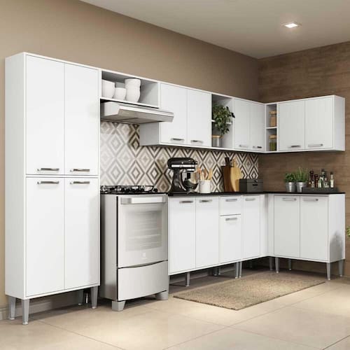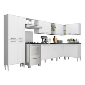 Conteúdo da Embalagem: 1 (um) nicho horizontal 1 (um) armário aéreo de 105 cm 1 (um) paneleiro duplo 1 (um) balcão com tampo de 105 cm 1 (um) balcão com tampo de canto 1 (um) armário aéreo de canto 1 (um) balcão com tampo de 70 cm 1 (um) armário aéreo de 70 cm