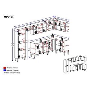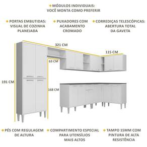 Dimensões do produto montado: Cozinha: Altura: 191 cm - Largura: 321 x 115 cm - Profundidade: 27,5 cm (aéreos e paneleiro) - 45 cm (balcão com tampo) Espaço do nicho para fogão/geladeira: Altura: 168 cm - Largura: 63 cm *Você pode consultar as medidas internas na imagem técnica do produto.