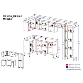 Conteúdo da Embalagem: 1 (um) nicho horizontal 1 (um) armário aéreo de 105 cm 1 (um) paneleiro duplo 1 (um) balcão com tampo de 105 cm 1 (um) balcão com tampo de canto 1 (um) armário aéreo de canto