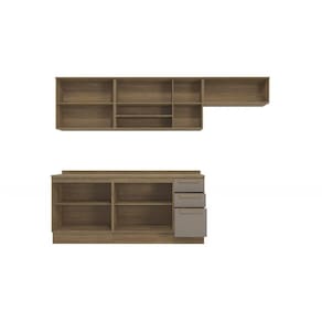 Sua cozinha completa com o Combo CB871 da Cozinha Botanic Kappesberg. Produzido em MDP de 15mm, com robustez e qualidade, o combo possui cinco peças. Com amplo espaço interno, o são as corrediças telescópicas nas gavetas, e as dobradiças com amortecimento nas portas, para um fechamento suave e sem ruídos. Com tampos e rodapés, os balcões acompanham as ferragens para ser montados suspensos na parede. E com sete camadas de pintura, a caixaria é em pintura touch na cor nogueira, e as frentes são na cor cinza, com acabamento fosco. O destaque fica para a telinha e molduras, presente em algumas portas, que lembram a palha natural e garantem leveza ao ambiente. Seus puxadores em alumínio e polipropileno na cor dourada, completam o diferencial do produto.