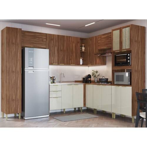 Tipo de corrediças: Telescópicas | Material dos pés: Polipropileno | Cor interna: Wengue | Acompanha pia?: Não | Quantidade de gavetas: 3 gavetas | Quantidade de portas: 16 portas | Material: MDP 15mm | Tampos 25mm | Complexidade de montagem: Média: pode ser montado por mais de uma pessoa e|ou necessite de maior conhecimento para montagem | Altura dos pés: 17cm | Cor: Wengue/Cristalo | Tipo de puxador: Externo | Conteúdo da embalagem: paneleiro, 2 aéreos 80cm, 1 aéreo 120cm, 1 aéreo de canto, a balcão 120cm, 1 balcão de canto, 1 balcão 80cm, módulo forno, kit ferragens e manuais de montagem | Manutenção e limpeza: Utilize pano umedecido com água | Tampo com recorte para cooktop?: Não, apenas demarcação para recorte | Altura: 240cm | Largura: 298,5x240cm | Dimensões: 240x298,5|240x52cm(AxL|LxP)
