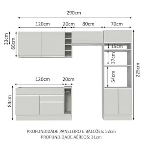 - As medidas totais da cozinha são: 290 cm de largura x 225 cm de altura. A profundidade é de 52 cm nos balcões e no paneleiro e 31 cm nos aéreos.