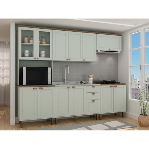 O balcão de 1,20 NÃO acompanha pia e nem o tampo. Acabamento da Prateleira: Pintura Texturizada UV Escala de Brilho da Prateleira: Fosco Acabamento da Gaveta: Pintura Escala de Brilho da Gaveta: Fosco Material do Puxador da Gaveta: ABS Acabamento da Porta: BP Melamínico Escala de Brilho da Porta: Fosco Material do Puxador da Porta: PVC Acabamento dos Pés: Pintura Acompanha Tampo: Não Altura dos Pés: 17 cm Ambiente Principal: Cozinha codigo_ean: 7909903402238 Complexidade da Montagem: Média: pode ser montado por mais de uma pessoa e/ou necessite de maior conhecimento para montagem Cor: Verde Mint/Ébano Fosco Cor do Produto: Verde Mint/Ébano Fosco Cor Flex: Não Cor Interna: Verde Mint Escala de Brilho: Fosco Espessura do Material da Estrutura: 15 mm Gaveta com Chave: Não Informações Complementares: Cozinha Completa com Cristaleira Forno 100% MDF Iluminata Itens Inclusos: Cozinha Completa com Cristaleira Forno, Kit Ferragens, Manula de Montagem Linha ou Coleção: Iluminata Manual de Montagem e Instalação: https://product-hub-prd.madeiramadeira.com.br/866925/documents/8c22c3b1-db3e-4396-8bdb-0ec94229407e1488317cm0023.pdf Material da Dobradiça/Corrediça da Porta: Metálica Material da Gaveta: MDF Material da Porta: MDF Material da Prateleira: MDF Material dos Pés: Plástico Medida de cada item (A x L x P): Cristaleira Forno (2,30x80x52)Aéreo de 1,20 (78x1,20x31,5)Balcão de 1,20 (91x,20x51)Aéreo basculante( 46,5x80x31,5)Balcão para cooktop (91x80x52) modular: Sim Montagem Flex: Não Necessita Montagem: Sim O Balcão Acompanha Pia: Não Origem do Produto: Nacional Pés Reguláveis: Sim Peso: 145,15 kg Peso Máximo por Gaveta: 5 kg Peso Máximo por Prateleira: 5 kg Possui Pés: 09 Possui Portas: Sim Possui Prateleiras: Sim Possui recorte para Cooktop: Não Possui Rodízio: Não Possui Vidro: Sim Produto Montado: Sim Recomendações de Uso, Manutenção e Limpeza: Para retirada do número de identificação da peça, usar pano levemente umidecido com alcool, para limpeza em geral pano seco Sapatas Niveladoras: Não Sistema de Montagem: Parafusos e Cavilhas e minifix Suporta Até (kg): 70 kg Tamanho Indicado da Pia: 1.2 Tamanho Indicado do Tampo: 1.2 Tipo de Corrediça da Gaveta: Metálica Telescópica Tipo de Dobradiça da Porta: Soft close Tipo de Puxador da Gaveta: Externo Tipo de Puxador da Porta: Externo Ean: 7909903402238