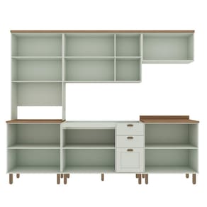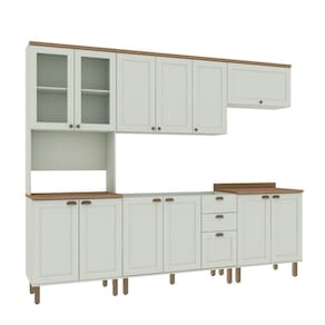 Todos os módulos são avulsos, fabricados com materiais de padrão superior, como corrediças telescópicas e dobradiça com amortecimento. As portas são estilo provençal.