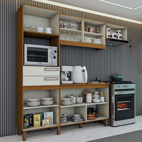 O(a) Cozinha Completa com Mesa e 4 Cadeiras Paulista 7 Portas 2 Gavetas Nature/Off White/Linho - Loja é produzido em MDF e MDP na escala de brilho Brilho e Fosco, e possui um grau de dificuldade de montagem: Médio.