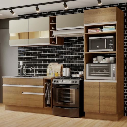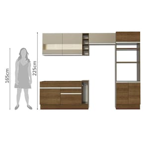 - Itens inclusos: Um balcão de pia com duas gavetas e uma porta (não acompanha tampo) | Um balcão porta panos com tampo de MDP em pintura amadeirado Rustic | Um aéreo com duas portas com detalhe em vidro Reflex | Uma adega | Um aéreo com uma porta basculante | Uma torre quente com dois nichos para forno e micro-ondas, um nicho menor e três portas, sendo uma basculante;