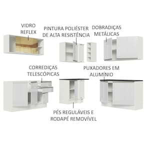 São diversos itens de qualidade superior: puxadores em alumínio, dobradiças metálicas, corrediças telescópicas e vidro reflex. Além disso, é fabricada em 100% MDF, material resistente e proveniente de florestas renováveis.