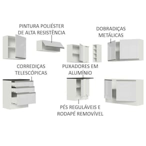 Possui itens de qualidade superior, como puxadores em alumínio, dobradiças metálicas e corrediças telescópicas. Além disso, é fabricada em 100% MDF, material resistente e proveniente de florestas renováveis.