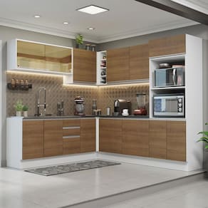 A linha de cozinhas Acordes é uma das mais queridinhas da Madesa. Nesta versão de canto, se destaca pelo ótimo espaço disponível.