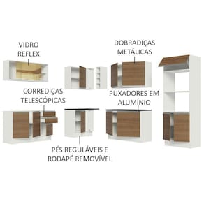 Qualidade nos materiais não falta: puxadores em alumínio, dobradiças metálicas, corrediças telescópicas e vidro reflex. Além disso, é fabricada em 100% MDF, materia proveniente de florestas renováveis e super resistente.