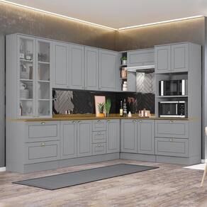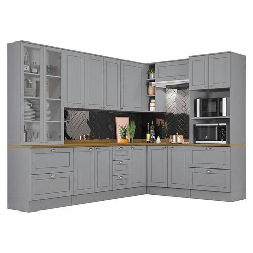 Cozinha Completa De Canto Americana 8 Peças Cinza Com Cristaleira E Tampo Nature - Móveis Henn Cinza