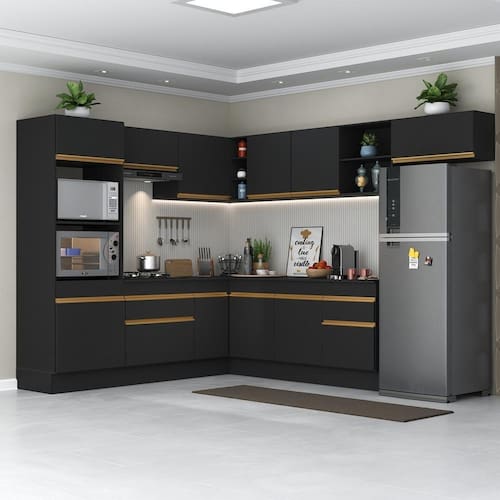 Conteúdo da Embalagem: 1 (um) armário para forno e microondas 62cm 1 (um) armário aéreo 70cm 1 (um) armário aéreo de canto 90cm 1 (um) armário aéreo 150cm 1 (um) balcão com tampo 70cm 1 (um) balcão com tampo de canto 90cm 1 (um) balcão com tampo 150cm 1 (um) armário aéreo 70cm 1 (um) kit com rodapés