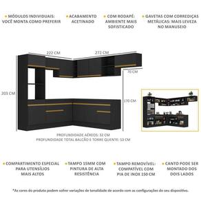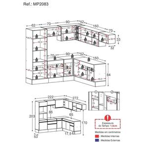 Dimensões do produto montado: Altura: 203cm | Largura: 222 x 272cm | Profundidade: 32cm (aéreos) - 53cm (balcão com tampo e paneleiro) *Você pode consultar as medidas internas na imagem técnica do produto.