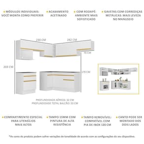 Dimensões do produto montado: Altura: 203cm | Largura: 230 x 242cm | Profundidade: 32cm (aéreos) - 53cm (balcão com tampo) *Você pode consultar as medidas internas na imagem técnica do produto.