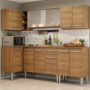 Os pés são em PVC, pensados para facilitar a limpeza e com regulagem que permite nivelar pequenas imperfeições no piso. Para completar, todos os balcões acompanham tampo em MDP. O acabamento é no padrão amadeirado Rustic, em Pintura Poliéster ecológica com 7 camadas de proteção, que oferecem resistência contra os efeitos da água e do calor. Os armários aéreos e o paneleiro precisam ser fixados na parede.