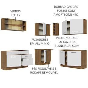 O acabamento da estrutura é em amadeirado Rustic e o das portas e frentes é branco. É feito em Pintura Poliéster com 7 camadas que protegem o móvel dos efeitos do álcool da água e do calor.