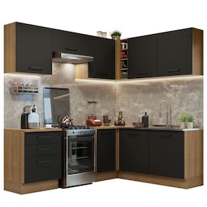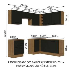 O acabamento da estrutura é em amadeirado Rustic e o das portas e frentes é preto. É feito em Pintura Poliéster com 7 camadas que protegem o móvel dos efeitos do álcool da água e do calor.
