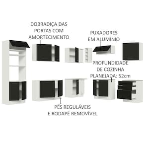Possui puxadores slim em alumínio, corrediças telescópicas nas gavetas e amortecedores para o fechamento suave das portas. Além disso, conta com pistão a gás na porta basculante.
