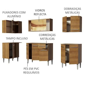 Itens inclusos: - Um (1) Armário aéreo de canto com uma (1) porta e uma (1) adega acoplada - Um (1) Balcão de canto com uma (1) portas e tampo - Um (1) Balcão com três (3) portas, uma (1) gaveta e tampo - Um (1) Armário aéreo com duas (2) portas - Um (1) Balcão com duas (2) portas - Um (1) Armário aéreo com duas (2) portas de correr de vidro