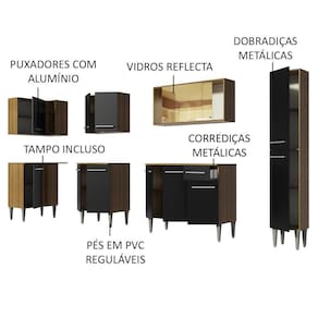 Itens inclusos: - Um (1) Armário aéreo de canto com uma (1) porta e uma (1) adega acoplada - Um (1) Balcão de canto com uma (1) porta e tampo - Um (1) Armário aéreo com duas (2) portas - Um (1) Balcão com duas (2) portas e tampo - Um (1) Armário aéreo com duas (2) portas de correr de vidro reflex - Um (1) Balcão com três (3) portas, uma (1) gaveta e tampo - Um (1) Paneleiro com duas (2) portas