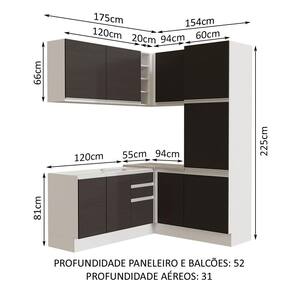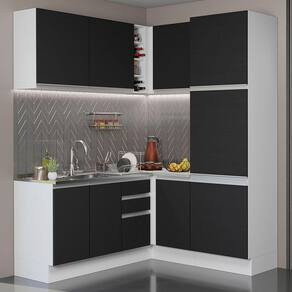 O acabamento da estrutura é branco e as portas e frentes são pretas. É feito em Pintura Poliéster com 7 camadas que protegem o móvel dos efeitos do álcool da água e do calor.