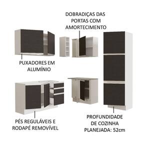 Para completar, o balcão maior permite a colocação de pias de inox ou pedra no tamanho de 120 cm x 52 cm. A cozinha conta ainda com pés reguláveis em PVC e rodapé removível em MDP de fácil encaixe, para retirar na hora de realizar a limpeza.