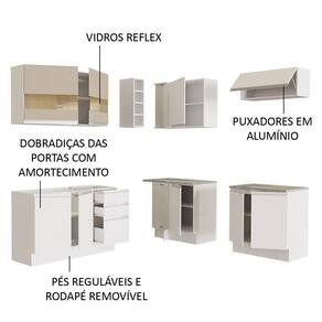 O acabamento é todo branco, com exceção das portas do aéreo com detalhe em vidro, que são em pintura Crema. É feito em Pintura Poliéster com 7 camadas que protegem o móvel dos efeitos do álcool da água e do calor.