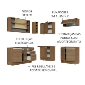 Por ser totalmente modulada, você pode organizar os armários e balcões conforme preferir no seu ambiente. Além disso, o canto pode ser montado tanto para o lado esquerdo quanto para o direito.