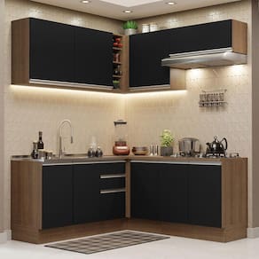 Totalmente modulada, permite organizar os armários e balcões conforme preferir no seu ambiente. Além disso, o canto pode ser montado tanto para o lado esquerdo quanto para o direito.