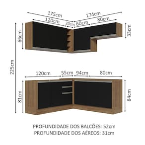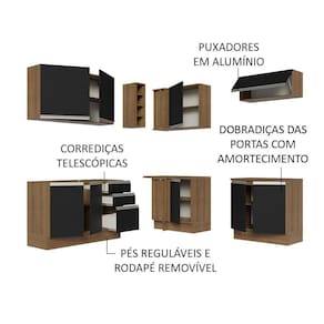 O acabamento da estrutura é no padrão amadeirado Rustic e as portas e frentes são pretas. É feito em Pintura Poliéster ecológica, com aplicação de 7 camadas de proteção resistentes a álcool, água e calor.