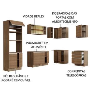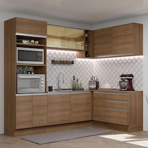 O acabamento da cozinha é no padrão amadeirado Rustic, com exceção das partes internas das gavetas e das costas, que são brancas. O processo é feito em Pintura Poliéster com 7 camadas que protegem o móvel dos efeitos do álcool da água e do calor.